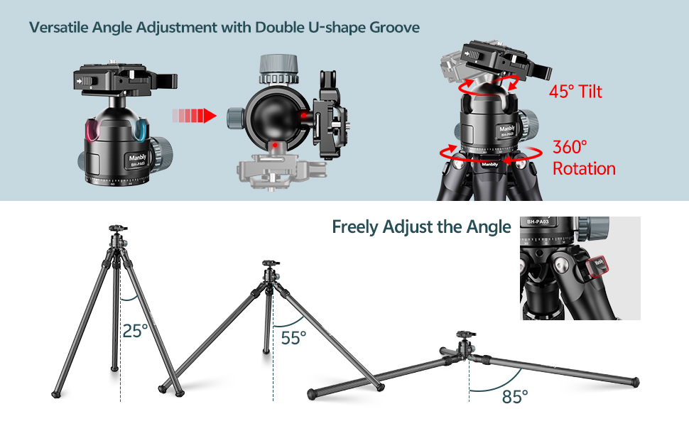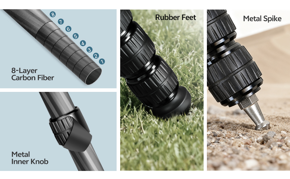 Made of carbon fiber, with adjustable leg tubes and rubber foot pads, it can adapt to uneven terrain and provide